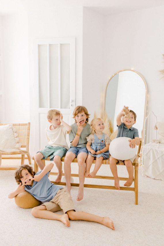 La séance avec Patricia & Hubert a été un vrai moment de vie. Dans mon studio à La Boissière-de-Montaigu, baigné de lumière naturelle, j’ai voulu simplement les laisser vivre : les rires des enfants, les gestes tendres, les regards complices.